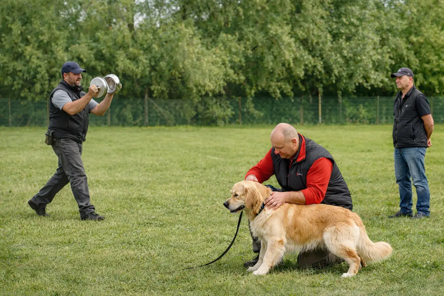 După verificarea microcipului, la o distanță minimă de cel puțin 5 metri de câine, un al doilea asistent trece în linie dreaptă prin fața câinelui în pas normal, producând zgomot în mod repetat cu ajutorul a două castroane metalice, a unei moriști de vânt sau a unui pet de plastic cu pietricele în el. Pe toată durata acestui exercițiu conductorul câinelui se va afla în raza vizuală a câinelui, iar câinele este ținut în lesă de către asistentul de arbitru.
