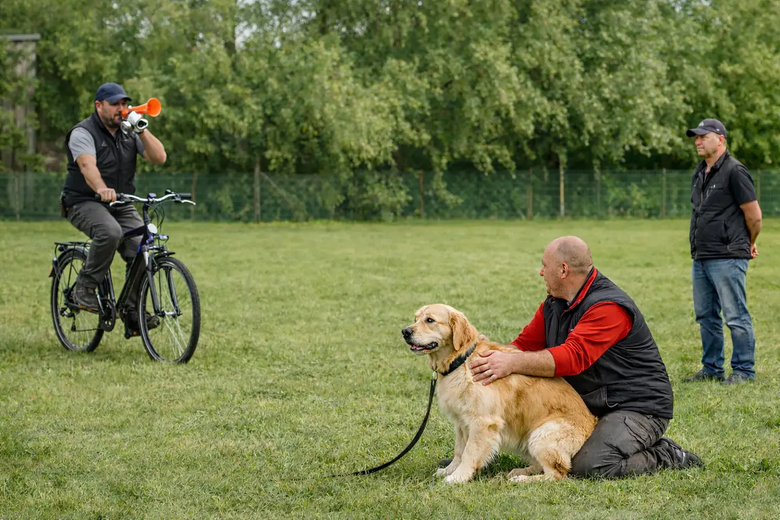 Din direcția din care conductorul câinelui a dispărut, iese cel deal doilea asistent de arbitru, mergând pe bicicletă și în același timp producând niște zgomote de intensitate medie (claxon, goarnă). Aceste zgomote vor fi produse înainte de intersectarea cu câinele (la nu mai puțin de 5 metri distanță) și după depășirea câinelui. Pe toată durata acestui exercițiu conductorul este dispărut din raza vizuală a câinelui.