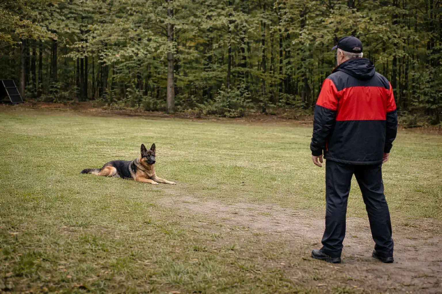 La indicația arbitrului conductorul câinelui lasă câinele într-o poziție la alegere și se îndepărtează pe o distanță de 20 de pași. La semnul arbitrului acesta cheamă câinele la el.